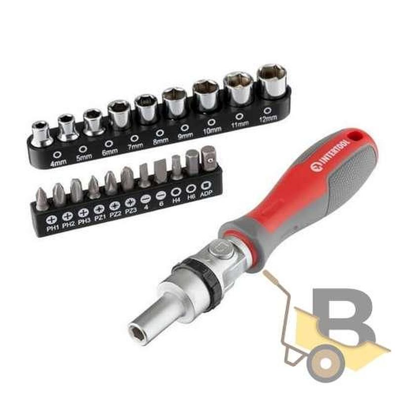 Тип - реверсивна з карданомКількість одиниць в наборі - 21 од.Біти - SL4, SL6, PH1, PH2, PH3, PZ1, PZ2, PZ3, H4, H6Матеріал виготовлення - Cr-V стальМатеріал рукоятки - прогумована, двокомпонентнаМагніт - єГоловки - 1/4" 4-12 мм