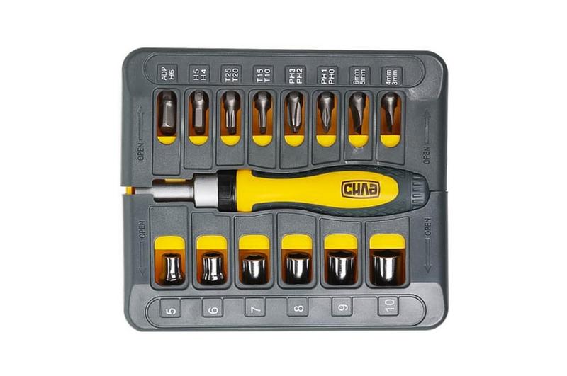 Биты: (6,35х25мм): 3мм, 4мм, 5ммм, 6мм, РН0, РН1, РН2, РН3, РН4, Т10, Т15, Т20, Т25, Н4, Н5, Н6; Материал рукоятки: пластик; Материал стержня: хром- ванадиевая сталь; Насадки: ¼: 5мм, 6мм, 7мм, 8мм, 9мм, 10мм; Тип отвертки: реверсивная