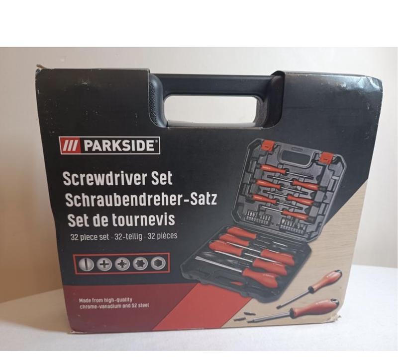 PARKSIDE Набір викруток, 32 шт. Оригінал. Опис продукту виготовлені з високоякісної хром-ванадієвої та S2 сталі чітке зберігання в міцному пластиковому футлярі Ергономічна форма ручок забезпечує комфортну роботу 32 шт Вміст: 4x хрестова викрутка: PH1 x 100 мм, PH2 x 125 мм, PZ1 x 100 мм, PZ2 x 125 мм 3 плоскі викрутки: 0,8 x 4 x 100 мм, 1,2 x 6,5 x 125 мм, 1,2 x 8 x 150 мм 6 прецизійних викруток SL: 0,4 x 2 x 75 мм, 0,4 x 2,5 x 75 мм, 0,5 x 3 x 75 мм, PH: PH00 x 75 мм, PH0 x 75 мм; PH1 х 75 мм 18 насадок 25 мм: шестигранник: 2 – 3 – 4 – 5 – 6 мм; TX: T10 – T15 – T20 – T25 – T30; PH: PH0 – PH1 – PH2; ПЗ: ПЗ0 – ПЗ1 – ПЗ2; SL: 0,8 x 4 / 1,2 x 8 1x магнітний вставний тримач тримач біт в комплекті матеріал сталь, пластик Розміри приблизно 29 x 25 x 5,5 см (Д x Ш x В)