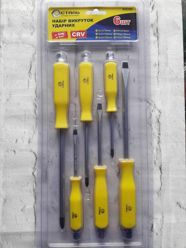 Набор ударных отверток 49096 Сталь 6 шт. Предназначен для работы с крепежом с резьбой с головками крест PH или шлиц SL. Рабочая часть изготовлена из высококачественной Cr-V стали. Пластиковая рукоятка обеспечивает удобный и надежный захват. Наконечник намагничен. Комплектация: SL 5,0 x 75 мм, SL 6,0 x 100 мм, SL 8,0 x 150 мм, Ph 1 x 75мм, Ph 2 x 100 мм, Ph 3 x 150 мм,