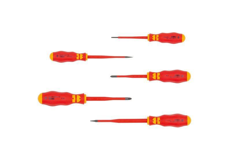 Набор отверток электроизолированных WURTH с компактной конструкцией стержня, шлиц и РН, 5 предметов: - Шлиц: 0,4×2,5×80 мм; 0,8×4,0×100 мм; 1,0×5,5×125 мм. - РН: РН1; РН2