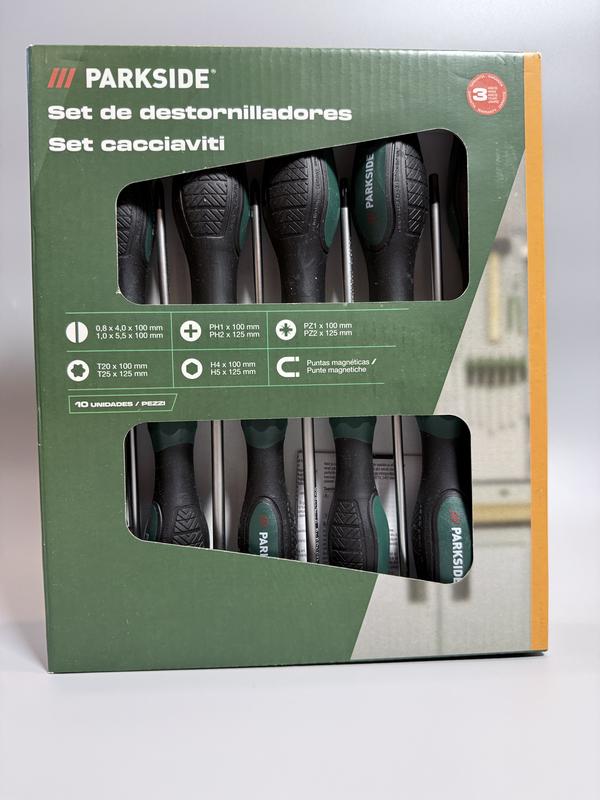 Набір включає 10 предметів, в тому числі викрутки з плоским шліцем, хрестоподібним шліцом (Phillips і Pozidriv), а також зіркоподібним шліцем (Torx) і шестигранником (Hex). Викрутки мають магнітні наконечники. Виготовлені з хром-ванадієвої сталі та сталі S2/3.