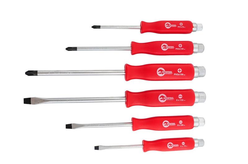 Набор ударных отверток HT-0403 применяется для откручивания заржавевших и прикипевших винтов и саморезов. Этот тип отверток в основном предназначен для бытового использования, хотя и в других производственных отраслях эти отвертки себя зарекомендовали положительным образом. Хвостовики отверток изготовлены из хром-ванадиевой стали, которая обеспечивает высокие эксплуатационные показатели и защиту от коррозии. В наборе НТ-0403 шесть отверток с насадками: SL5, SL6, SL8; PH1, PH2, PH3. Особенности Хвостовики отверток сделаны из хром- ванадиевой стали, делающей инструмент прочным и надежным, с антикоррозийной защитой, Практичный дизайн и эргономичная рукоять гарантируют удобство работы с отвертками. Количество в наборе: 6 ед.