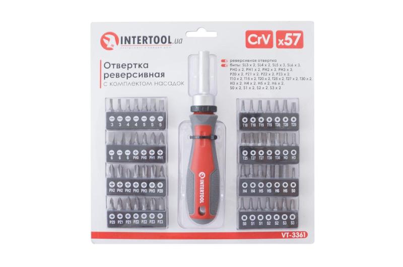 Отвертка с комплектом насадок изготовлена по последним технологиям и соответствует высоким запросам мастеров. Предназначена для монтажа и демонтажа резьбовых соединений с различным типом шлицов. Такая реверсивная отвертка станет отличным помощником в домашнем арсенале инструмента, а также в собственной мастерской, на производстве. Высокое качество стали Насадки и отвертка изготовлены из прочной Cr-V стали, которая известна всем мастерам своей надежностью и выносливостью. В составе этой стали присутствуют хром и ванадий, которые придают изделию высокую стойкость к износу. Также сталь отличается долговечностью и не подвержена хрупкому разрушению. Все инструменты в наборе покрыты антикоррозионным слоем. Отвертка с магнитом и храповым механизмом Внутри отвертки установлен магнит для надежного удержания насадок. Храповый механизм позволяет работать в ограниченном пространстве и в труднодоступных местах, где нет места для маневров. Удобная рукоятка Форма ручки обеспечивает максимальную эффективность от приложенного усилия, а наличие реверса делает работу более комфортной. Двухкомпонентная рукоятка гарантирует отличное сцепление даже с влажными или скользкими руками, благодаря резиновым вставкам. Биты размещены в держателях и не выпадают. Вы быстро найдете необходимую насадку, благодаря нанесенной маркировке под каждой ячейкой. Комплектация: Отвертка реверсивная 1/4"; биты: SL3x2, SL4x2, SL5x3, SL6x3, PH0x2, PH1x2, PH2x3, PH3x3,PZ0x2, PZ1x2, PZ2x2, PZ3x2 T10, T10x2, T15x2, T20x2, T25x2, T27x2, T30x2, H3x2, H4x2, H5x2, H6x2, S0x2, S1x2, S2x2, S3x2. Количество единиц в наборе: 57 ед.; Материал рукоятки: прорезиненная, двухкомпонентная; Магнит: есть