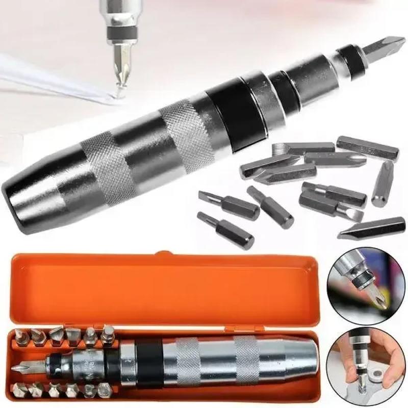 Набор ударных отверток 14 предметов с переходником и битами, ударно-поворотная отвертка 1/2" Набор ударных отверток из 14 предметов. Impact lot AND - надежный и практичный инструмент, идеально подходящий как для профессионалов, так и для домашних мастеров. Все элементы набора изготовлены из высококачественной хромо-ванадиевой стали, устойчивой к износу и нагрузкам. Эргономичная накатанная ручка отлично ложится в руку и не скользит во время работы, обеспечивая надежный захват. Удобная пластиковая упаковка делает хранение и транспортировку максимально комфортной. Преимущества: Ударно-поворотная отвертка с реверсом Прочная сталь Cr-V - высокая износостойкость. Ручка с накаткой - крепкий захват и контроль. Универсальные насадки - крестовые и шлицевые биты. Удобная упаковка для хранения и переноски Подходит для демонтажа прикипевших и ржавых винтов. Совместимость с битами 1/2" через переходник Характеристики: Тип: ударно-поворотная отвертка с комплектом бит Материал: хромо-ванадиевая сталь (Cr-V) Длина бит: 35 мм и 75 мм. Крепление: 1/2 дюйма Назначение: откручивание заржавевших винтов. Упаковка: пластиковый кейс Вес набора: ~1 кг