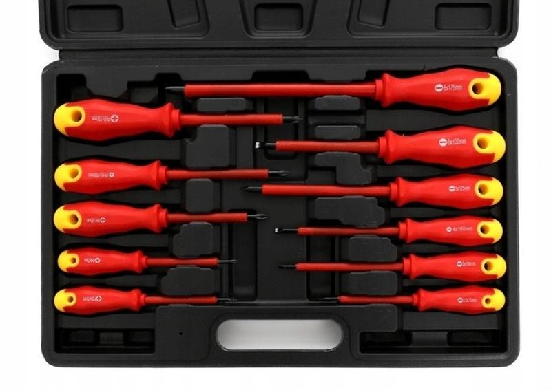 Викрутки, ізольовані, загартовані, магнітні викрутки для електриків, набір з 12 предметів. Цей набір викруток виготовлений з високоякісних матеріалів, зокрема хромованадієвої сталі, а ручки виготовлені з м'якого, міцного матеріалу з м'яким покриттям, що запобігає ковзанню! Біти викрутки мають магнітні наконечники та покриття по всій довжині, щоб мінімізувати ризик контакту рук з металом. Наші викрутки можуть працювати під напругою до 1000 В. Склад набору: - плоский: 2,5 x 75/ 3 x 100/ 4 x 100/ 5 x 125/ 6 x 100/ 8 x 175 мм - Хрестовий шліц: PZ 0x60/ PH 0x60/ 1 x 80/ 1 x 100/ 2 x 100 мм - дипломат Технічні дані - Матеріали: хромованадієва сталь, матеріал з м'якою накладкою