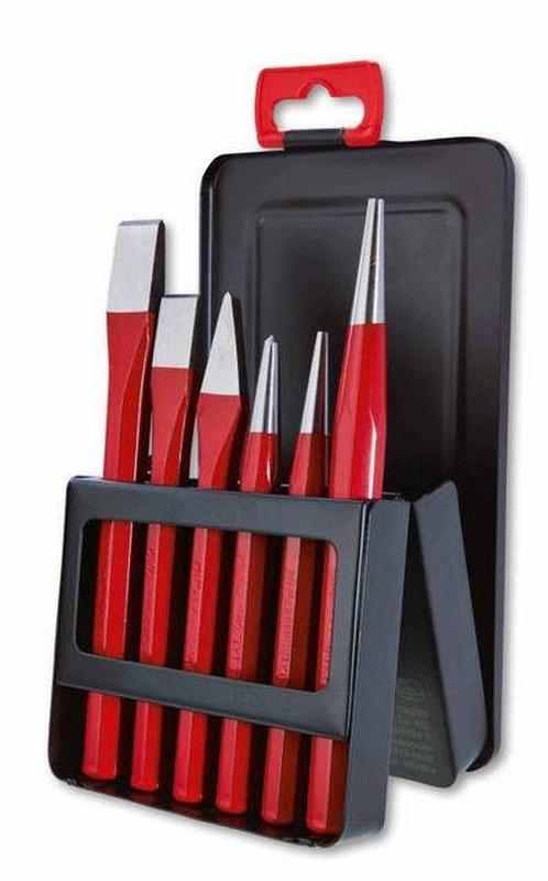 Комбинированный набор ударных инструментов Высококачественный инструмент из хромованадиевой стали • В прочном металлическом ящике для безопасного хранения -6 штук 2 плоских долота: 130 x 12 мм, 150 x 15 мм (Д x Ш) Для удаления выступающего бетона или раствора остатки 1x поперечное долото: 130 x 4 мм (L x D) для обработки узких канавок или внутренних краев 2 пуансона: 120 x 3 мм, 150 x 4 мм (Lxp) для пробивки листового металла 1x пуансон: 120 x 4 мм (LX 0) для маркировки и предварительного тиснения точек сверления на металлических поверхностях