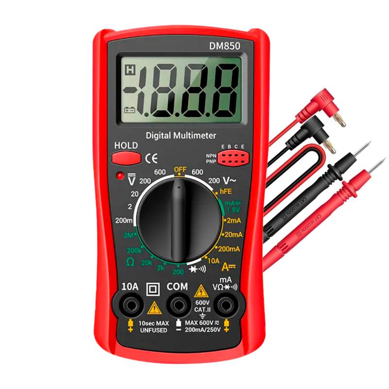 Цифровой мультиметр ANENG DM850 автоматически измеряет напряжение по технологии True RMS, постоянное напряжение и сопротивление. Если сопротивление меньше 50 Ом, активируется зуммер, т.е. устройство может работать в режиме вызова. Встроенный датчик NCV позволяет обнаруживать обрывы в проводах с переменным и постоянным напряжением (скрытая проводка, силовые кабели и т.п.). Цифровой мультиметр оснащен ЖК-дисплеем, подсветкой дисплея, функцией Data Hold и автоматическим измерением величин. Встроенный фонарик улучшает удобство использования. В коробке: мультиметр, щупы, инструкция. Диапазоны измеряемых величин: - переменное напряжение: 200 мВ – 600В ±2%; - постоянное напряжение: 100 мВ – 600В ±2%; - постоянный ток: 0 – 10 А; - сопротивление: 0 – 2 МОм ±2.5%; - прозвонка цепи: + - Перевірка біполярних транзисторів: + - Тестер батарей: 1.5 (мА); - Зумер: + - Збереження даних: + - Живлення: Крона 6F22 (у комплекті немає). В наличии много других мультиметров и приборов измерения. Спасибо, что посетили магазин. Для удобства поиска товара заходите в "Каталог продавца/Категории продавца".