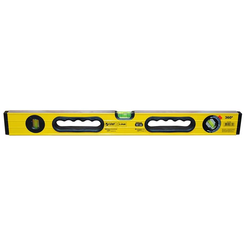 Уровень алюминиевый 360 ° - это уровень, который изготовлен из алюминиевого профиля с 3 глазками: 2 глазка для определения углов 0 ° и 90 °, а также 1 поворотный глазок на 360 °. Уровень с тремя колбами считается универсальным уровнем, с его помощью можно проверить горизонталь и вертикаль, а также проконтролировать правильность наклонных линий и плоскостей (0 °, 45 °, 360 °). Точность уровня алюминиевого 360 ° составляет 0,057 °. Данный уровень усилен ребрами жесткости. На уровнях длиной от 60 см до 200 см присутствуют два отверстия для захвата. Специальные вставки для рук (отверстия для захвата) обеспечивают удобную работу с инструментом, комфортный захват инструмента, особенно в труднодоступных местах.