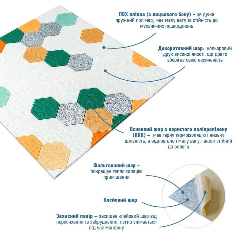 Самоклеящиеся 3D панели – декоративное покрытие для стен, выполненное из легкого и прочного материала – пористого полипропилена (ППП). Основная особенность - рельефный рисунок в виде кирпичей в широком разнообразии цветовой гаммы и наличие клеевого слоя, что позволяет установить панели без необходимости применения дополнительных материалов. Панели состоят из следующих слоев: 1. ПВХ пленка (с лицевой стороны) - это полимер, состоящий из длинных цепей молекул винилхлорида, в которых содержаться атомы хлора, это придает материалу устойчивость к воздействию химических веществ, а за счет аморфности кристаллической решетки ПВХ очень упругий и легкий. 2. Декоративный слой: цветная печать высокого качества, долго сохраняющая свою насыщенность. 3. Основной слой из пористого полипропилена – это термопластичный полимер, его структура включает повторяющиеся молекулярные единицы пропилена. Он имеет ячеистую структуру, благодаря чему обладает хорошей термоизоляцией и низкой плотностью, а соответственно и малым весом. Пористый полипропилен так же устойчив к влаге и химически инертен. 4. Клеевой слой: нетоксичное основание с высоким уровнем адгезии. 5. Защитная бумага: оберегает клеевой слой от пересыхания и загрязнения, легко снимается при монтаже. Основные преимущества 3D панелей из ППП: 1. Легкость: благодаря своей структуре материал имеет малый вес, это облегчает транспортировку (при этом делая ее более экономичной) и установку. 2. Изоляционные свойства: пористый характер материала, помимо малого веса, придает ему хорошие тепло- и звукоизоляционные свойства. 3. Простота монтажа: наличие клеевого слоя позволяет установить панели без необходимости применения дополнительных материалов. 4. Гибкость и прочность: гибкость материала позволяет ему адаптироваться под различные, даже не самые ровные поверхности, при этом сохраняя прочность. 5. Устойчивость к воде и химическим веществам: пористый полипропилен обладает хорошей устойчивостью к влаге, это дает возможность применять его в помещениях с повышенной влажностью, а благодаря защитной ПВХ пленке, панель можно мыть бытовыми моющими средствами (без использования щетки с высокой абразивной способностью). 6. Экологическая безопасность: полипропилен не имеет запаха, а также является безопасным и стабильным материалом с точки зрения заботы об окружающей среде, поддается вторичной переработке. Панели подходят для внутренних отделочных работ: декорирования и теплоизоляции стен во всех видах жилых и коммерческих помещений, а также для декорирования и восстановления мебели, дверей и других, даже не совсем ровных поверхностей. Расчет нужного количества материала: 1. Измерьте длину и ширину оклеиваемой поверхности. 2. Умножьте длину на ширину каждой поверхности в метрах и составьте полученные результаты, чтобы получить площадь. К примеру, после измерений вы получили: Длина стены 3,7 м. Ширина стены 2,7 м. 3,7*2,7 = 9,99 м ² 3. Получившуюся площадь необходимо разделить на площадь одной панели (700*770= 0,539 м²) и округлить в большую сторону: 9,99/0,539=18,53 округляем до 19.В процессе монтажа могут возникнуть отходы, связанные с порезкой панелей, поэтому рекомендуется добавить в расчет запасные 1-2 шт. Монтаж: 1. Необходимо убедиться, что поверхность, на которую вы собираетесь установить панели, чистая, сухая и ровная. Не