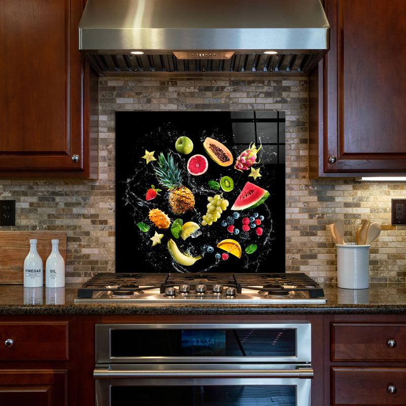 Стеклянная панель для кухни "всплеск плодов" 50х50см