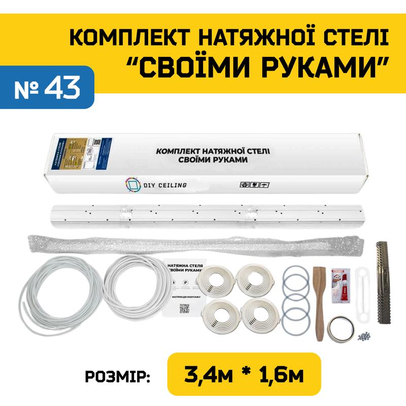 Натяжной потолок "Своими руками" - это возможность самостоятельно создать пространство своей мечты. Теперь Вы можете легко и креативно создать элегантный и стильный натяжной потолок без помощи специалистов и с экономией до 75%! Преимущества: - экономия до 75% средств на монтажных работах; - простой монтаж, не требующий специальных навыков; - монтаж без использования специальной тепловой пушки. Набор содержит: - белое матовое полотно, - профиль ПВХ, - гарпун, - декоративную вставку на профиль, - платформу для люстры, - 4 платформы для точечных светильников 55-110 мм, - термокольцо для люстры, - 4 термокольца 75мм, - подвесы, - саморезы, - универсальный обвод для трубы, - малярный скотч, - суперклей, - шпатель, - инструкцию по легкому монтажу. Инструкция шаг за шагом поможет Вам с легкостью овладеть процессом, даже если Вы новичок в ремонтных делах. Монтаж натяжного потолка очень прост и занимает всего несколько часов. Не требуется профессиональное тепловое оборудование, достаточно иметь обычный фен - для расглаживания складок. 1) Измерьте размеры комнаты, где хотите установить потолок; 2) Добавьте к каждому размеру 20 см; 3) На сайте выберите комплект, который подходит Вам лучше всего. Важно, чтобы запас полотна составлял не менее 20 см к каждой стороне, он может быть и больше; в телефонном разговоре с менеджером при необходимости измените комплектацию под свои нужды. Позвольте себе сэкономить до 75% средств на монтаже без экономии качества!