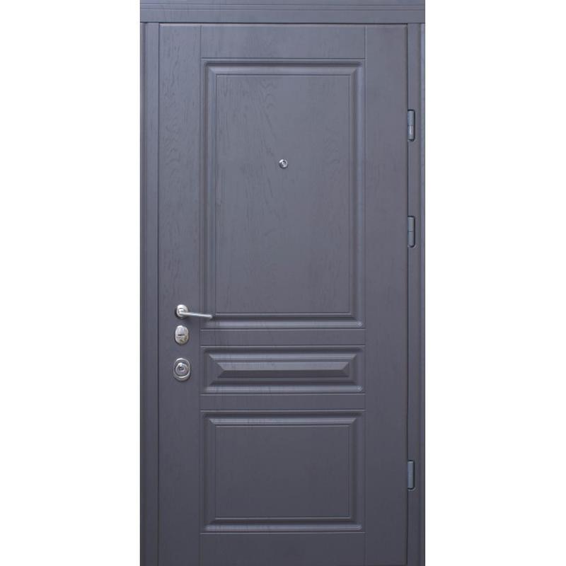 Двері Страж Prestige Рубін 2 кольори. Двері серії Prestige забезпечують максимальний захист і найвищий рівень безпеки. Колір - Дуб графіт -зовні, Усередині — світла софт айс. Технічні Характеристики: Коробка -ширина 130мм, пофарбована високоміцною термостійкою порошковою фарбою, потрійної контур капронового ущільнювача, посилена відповідна планка замкових ригелів 5 мм, теплоізоляція — кам'яна мін.вата TERMOLIFE - р=115кг/м.кв, регульований пристрій притискання дверного полотна Петли - конусні 3 шт., діаметром 22х100 мм, Полотно - товщина 95 мм, сталевий лист 1,8 мм, силовий каркас із вертикальними та горизонтальними ребрами жорсткості, наповнення хввата "Совер" 60 мм, антизрізи 4 шт., Захисна марганцева бронепластина - Hardox 3 мм, для захисту замка від висвердлювання. Декоративне покриття - фрезеровані плити МДФ 12 мм із покриттям ПВХ Замок: Mottura 54.797- Matic (5+2) моноблок (Італія) Девіатор (краб) Mottura, сувальний — 5 ключів із перекодуванням, Циліндр - Mottura Project 90 (5+1), захищений броненакладкою Mottura Глазок - Armadilo Наличник - МДФ 16х70 мм із покриттям ПВХ Ручка На розетці System Kaya