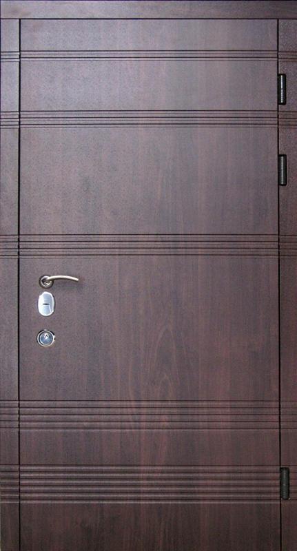 Технические характеристики: Размер: стандарт 860*2050; 960*2050 (+300 грн) -Цвет: Темный орех ПВХ-80 -Накладки: 16/10 мм, узор с двух сторон -Толщина полотна: 110 мм Толщина металла плотна: 1,5-1,8 мм -Толщина короба: гнутый профиль 140 мм (утеплён мин.ватой), евроуплотнитель, порог с нержавейки -Фурнтура: 3 наружные петли, глазок, ручка розетка, утопленные броненакладки -Замок : двухсистемный Mottura-797 (Italy)