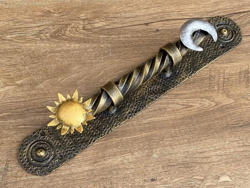 Ищете необычную дверную ручку? Вот то, что вам нужно! Эта необычная дверная ручка, украшенная символами солнца и луны, придаст красоте вашему дому и подчеркнет его внешние особенности. Выполнено в технике художественной ковки. Это действительно очень хорошая и очень необычная дверная ручка, которая удивит любого. Размеры: Длина крепления - 40см Ширина крепления - 7 см Кованые металлические ручки сделают вашу дверь уникальной и декоративной. Изготовленные со страстью и удивительными кузнечными навыками, они смотрятся очень элегантно и аристократически. Особенностью ручек является их крепкость и долговечность. Массивные и дорогие с виду дверные ручки и фурнитура повышают статус дома и создают дополнительную изысканность Вашего жилья. Добавьте шарма своему дому! Обратите внимание, что принимаются индивидуальные заказы (другой цвет, размер, содержимое). Кроме того, данную ручку можно персонализировать (добавить гравировку).