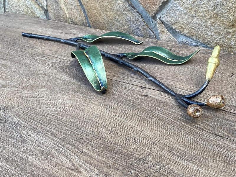 Ищете необычную дверную ручку? Вот собственноручно кованая дверная ручка в виде эвкалипта с цветком, семенами и листьями. Сама ручка выглядит как листочек. Она изготовлена в технике художественной ковки. Размер: Высота: 55 см Ширина: 17 см Цвет: черный с зеленым, бронзовым или золотым налетом. Эта дверная ручка точно создаст особый акцент в вашем интерьере.