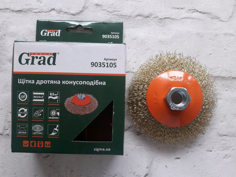 Щітка дротяна конусоподібна Ø100мм М14×2 мм (латуньована) GRAD (9035105) Щітки застосовуються для механічного очищення поверхні виробів від природних або штучних нашарувань - застарілих лакофарбових покриттів, бруду, іржі, окалини, шлаку і бризок. Конусоподібні щітки рекомендують для обробки важкодоступних місць та внутрішніх поверхонь. Характеристики: Сталевий гофрований латуньований дріт Ø0.3мм; Латуньоване покриття захищає робочу частину від корозії; Щадна обробка поверхніх