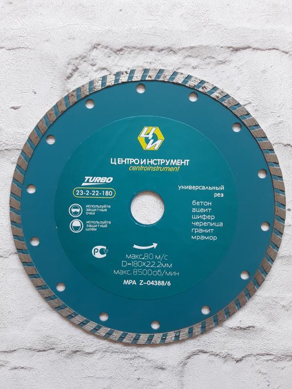 Виробник: Інший виробник Кілька примірників у наявності Алмазні диски турбо призначені для різання наступних матеріалів - бетону, залізо-бетону, шиферу, черепиці, граніту та мармуру. Диски алмазні Центринструмент Алмазні диски турбо призначені для різання наступних матеріалів - бетону, залізо-бетону, шиферу, черепиці, граніту та мармуру. Характерна особливість - підвищена зносостійкість та довговічність при інтенсивній роботі. Характеристики: Тип диска – турбо; Упаковка – 1 шт; Зовнішній діаметр – 180 мм; Внутрішній діаметр - 22.2 мм; Товщина диска – 2.2 мм; Висота алмазного шару – 7.5 мм; Максимальна частота обертання - 8500 об/хв;
