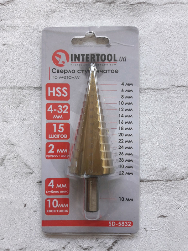 Ступінчасте (крокове) свердло - відмінний помічник для делікатного свердління отворів великого діаметру в листових металах та пластику. Ступінчаста структура дозволяє свердлити отвори різного діаметру (4-32 мм), без заміни ріжучого інструменту. Циліндричний хвостовик (10 мм) дозволяє встановлювати свердло в будь-який дриль, шурупокрут або свердлильний верстат. Особливості Заощаджує Ваш час та сили. Одним свердлом можна просвердлити 15 різних діаметрів отворів (4, 6, 8, 10, 12, 14, 16, 18, 20, 22, 24, 26, 28, 30, 32 мм). Довгий термін служби. Конусне ступінчасте свердло виготовлено з високоміцної швидкоріжучої сталі (High-Speed Steel). Свердлить без прослизання. Циліндричний хвостовик з фрезерним проточуванням під лапки патрона електроінструмента. Глибина кроку – 4 мм дозволяє робити наскрізні отвори в листових матеріалах, профілях і трубах. Свердло має конічну форму, з зростаючим діаметром на 2 мм за крок. Ріжучі кромки виготовлені з швидкоріжучої HSS сталі, ефективно справляються зі своєю роботою та довго залишаються гострими. При необхідності свердло можна заточити. Вигини на ріжучій кромці (між кожним кроком) дозволяють проточувати фаску, завдяки чому матеріал не деформуються, а отвори виходять рівними, без задирок. Дві широкі канавки без проблем відводять стружку та забезпечують охолодження робочої частини інструменту. Всередині однієї з канавок нанесена шкала діаметрів, що значно спрощує роботу. Якщо не перевантажувати свердло високими обертами та використовувати мастильно-охолоджувальні рідини, воно гарантовано прослужить довше.