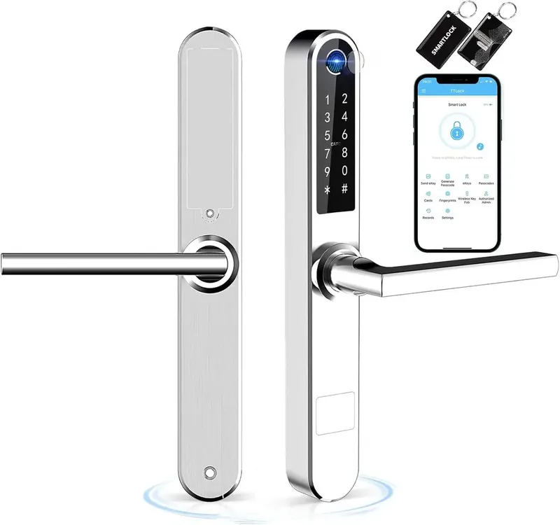 Ruveno Slim Smart Fingerprint Door Lock с ручками, бесключевой доступ, Bluetooth-клавиатура со сканером отпечатков пальцев и картой для бесключевого доступа для алюминиевых распашных деревянных дверей (серебристый) Об этом товаре 🔓[ Многоточечная система ] Замок Ruveno совместим с 90% многоточечных замков UK "Lift Up To Lock". Важно: дверная ручка Ruveno может поворачиваться только на 45 градусов, если ваша существующая дверная ручка имеет угол 60 или 75 градусов, многоточечного запирания может быть недостаточно для полного втягивания после установки. (Длина замка Ruveno составляет 280 мм, если длина корпуса вашего оригинального замка длиннее, чем у нас, то нижнее отверстие может быть не полностью закрыто, обратите внимание!) 🔓[ 3585 Врезной ] Дверной замок Ruveno slim поставляется с 3585 мотивом в упаковке по умолчанию. 🔓[Многофункциональный замок с отпечатком пальца] 6-в-1 дверной замок без ключа, разблокировка одним шагом. Шесть независимых методов разблокировки, Wi-Fi (опционально), приложение Bluetooth, отпечаток пальца, пароль, карта и механический ключ. Поддержка до 200 отпечатков пальцев, 150 кодов доступа и 200 кодов пользователей идентификационных карт. 🔓 [Управление через приложение Bluetooth] Умный замок входной двери, встроенный в приложение TT lock, один шаг для блокировки и разблокировки умного замка. Вы можете установить и поделиться паролем с семьей и гостями. Получайте оповещения, когда кто-то разблокирует дверь, не стесняйтесь следить за состоянием двери и историей доступа, настройки автоматического замка и режима прохода учитывают вашу безопасность и удобство, поддерживают устройства IOS и Android. 🔓 [Цифровой сенсорный экран и энергосбережение] Биометрический дверной замок, определяемые пользователем коды из 4-9 цифр, сенсорная клавиатура автоматически загорается при нажатии любой кнопки. 4 батарейки типа AAA поддерживают разблокировку 5000-6000 раз (не входят в комплект). Аварийный порт USB для зарядки и методы аварийной разблокировки ключа обеспечивают двойную гарантию. Советы: порт USB нельзя использовать для питания замка или зарядки внутренних батарей.
