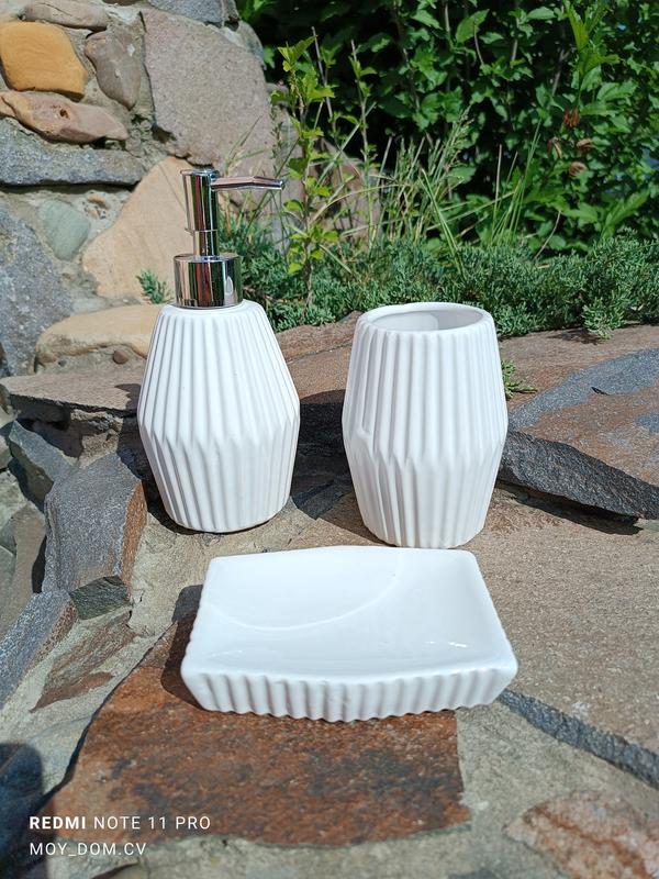 Набір керамічних аксесуарів Bright Bath "Білий Луч" для ванної кімнати. Оригінальний білий глянсовий набір аксесуарів для ванної кімнати або кухні. У комплекті 3 предмети: — дозатор для рідкого мила або лосьйону 350 мл (Ø8.5 см, висота — 18 см); — прямокутна мильниця (11.6х8.3 см, висота — 2.5 см); — склянка-підставка для зубних щіток 350 мл (Ø8.5 см, висота — 11.6 см).Набір аксесуарів Bright Bh "Білий Луч" для ванної кімнати упакований у картонну коробку з блістерною кришкою.