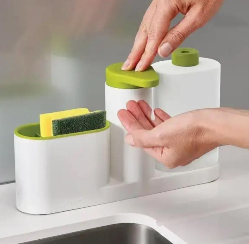 Удобный органайзер с дозатором для мыла для ванной и кухни, система для организации раковины 3 в 1 STORAGE BOX Органайзер для мойки с дозатором для мыла 3 в 1 STORAGE BOX XL-289 - очень компактный и удобный в использовании. Благодаря компактному дизайну данный органайзер может быть размещен даже на узкой стороне раковины. Теперь пространство за кухонной раковиной будет использоваться с максимальной эффективностью! Держатель для кухонных принадлежностей 3 в 1 STORAGE BOX XL-289 предназначен для организации хранения моющих и чистящих средств возле кухонной раковины. Каждая хозяйка хранит средства для мытья, губки и ершики для посуды в разных местах - с нашим органайзером эти вещи всегда будут под рукой. Кухонный органайзер STORAGE BOX - это оригинальное решение для хранения средств для мытья посуды. Маленькая ячейка предназначена для хранения ершика, большая ячейка нужна для хранения губки или скребка, а также бутылочка для моющих средств объемом 200 мл.