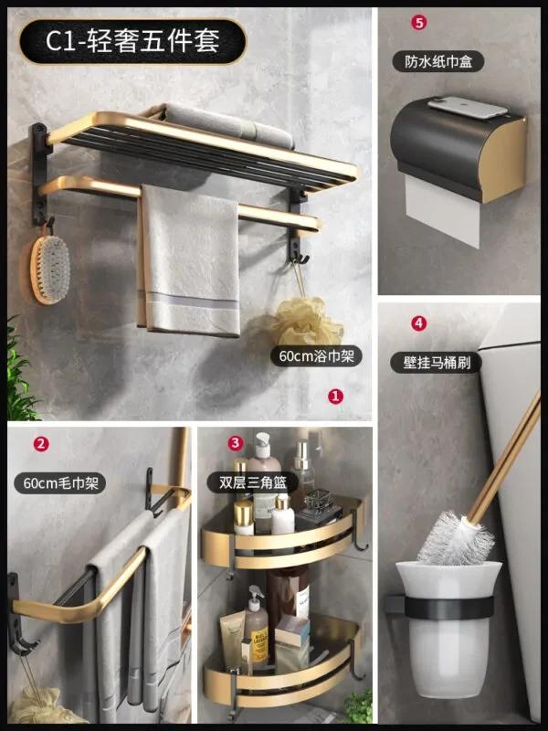 Создайте чистую и высококлассную обстановку в ванной комнате. Это прекрасный подарок для нового дома. Набор полок, держателей и вешалок для ванной комнаты Основной материал: алюминий В набор входит: - вешалка - держатель для полотенец - угловая двойная полка - крючки - держатель туалетной бумаги - ершик