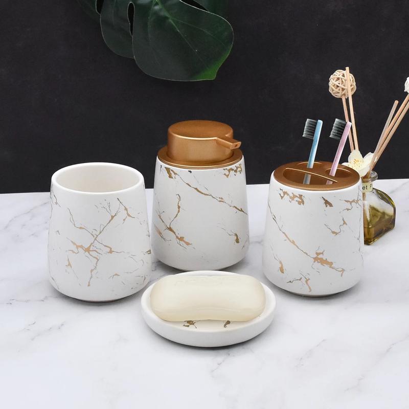 Бренд Bathlux отличается от остальных брендов тем, что предлагает самые современные и модные технологии в текстиле, аксессуарах и декоративных изделий для ванной комнаты, все они изготовлены на качественной основе и с интегрированными решениями, помогающими экономить энергию, воду и жить более экологичным способом. Особое внимание уделено дизайну изделий для ванных комнат. Набор аксессуаров для ванной комнаты выполнен из качественной керамики. Керамический набор в ванную комнату состоит из 4 предметов: дозатор для жидкого мыла 400 мл, размер 12.5 х 8.5 см; стаканы для зубных щеток и пасты 400мл, размер 10 х 8 см; мыльница 11.4 см
