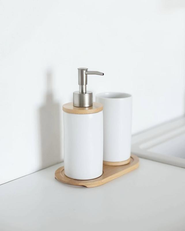 До набору входить : • дозатор для рідкого мила • ємність для зубних щіток • підставка з бамбуку Набір доступний до замовлення у трьох кольорах : чорний, білий, бежевий __________________________________________ Матеріал : ємності виконані з кераміки, носик дозатору для мила виповнений з пластику, підставка виповнена з бамбуку. Вартість - 400 грн/один набір