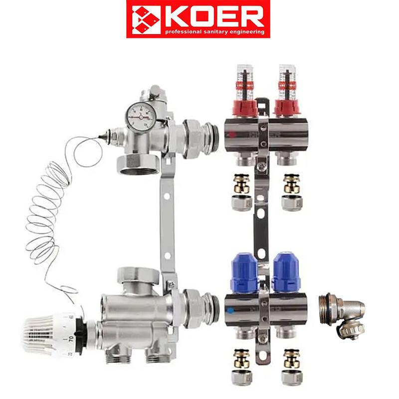 Коллекторный узел в сборе нижнее подключение на 2 выхода для системы "теплый пол" koer (че...