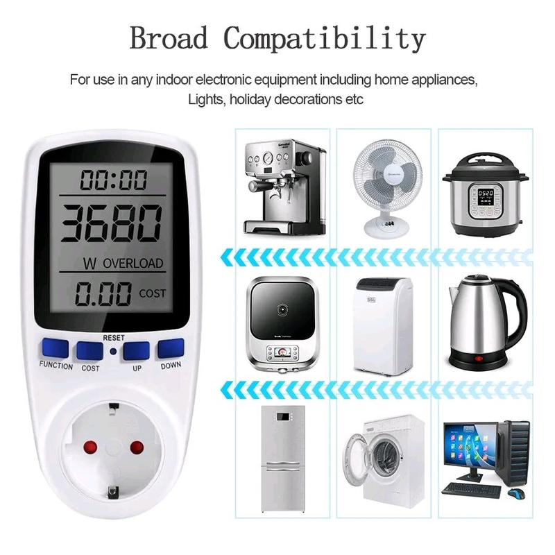 Есть доставка любой почтой, можете сразу заказывать, есть в наличии. Цифровой ваттметр 220 V 3600Wt. Устройство позволяет замерять параметры и нагрузку сети. Также с помощью энергометра можно вести учет расхода потребляемой электроэнергии устройствами, подключенными через него. С помощью энергометра можно измерять напряжение, мощность и силу тока в сети. Для использования всего функционала устройства используются 7 режимов, все они по-разному отражаются на 3-дюймовом дисплее. Переключение между режимами изображения происходит по нажатию кнопки FUNCTION, расположенной под дисплеем. Информация на дисплее делится на 3 линии (ряда). В первой линии всегда отображается счетчик времени активного использования подключенных устройств. При первом запуске показывается время в формате минут (00-00, где первые 00 это минуты), как только время будет более 60 минут, показ станет в формате часов (00-00, где первые 00 отражают часы). После того, как время на счетчике переваливает за 23-59, счетчик обнуляется и начинается новый отсчет с 00-00, на экране отображения второго режима работы количество дней меняется с 0 на 1 и т.д. Во второй и третьей линиях отображаются данные в соответствии с выбранным режимом: 1 режим - потребляемая мощность в данный момент в ваттах, под цифрами изображается символ W и ниже суммарная стоимость израсходованной электроэнергии в цифрах 2 режим - количество израсходованной электроэнергии в киловаттах, под цифрами изображаются символы kWh, ниже количество дней учета 3 режим - напряжение в розетке в этот момент в вольтах, под цифрами изображается символ V, ниже изображается частота сети, используемая в герцах 4 режим - сила тока в этот момент в амперах, под цифрами изображается символ А, ниже изображается коэффициент мощности (power factor) 5 режим - минимальная зафиксированная мощность, под цифрами выводится символ W, ниже от символы Lo 6 режим - максимальная зафиксированная мощность, под цифрами выводится символ W, ниже символы Hi 7 режим - стоимость электроэнергии за 1 кВт/ч. Чтобы настроить стоимость электроэнергии, необходимо нажать кнопку COST на 3 секунды. После этого в 3-й линии мигают цифры 00.00, перемещение значений происходит нажатием на кнопку FUNCTION, изменение значений происходит нажатием на кнопки UP и DOWN. В энергометре встроена 3.6 В заряжаемая аккумуляторная (Ni-Mh) батарея, необходимая для сохранения в памяти параметров и учитываемых данных.