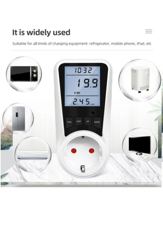 Цифровий ватметр змінного струму, лічильник електроенергії, моніторинг споживання електроенергії, кіловат-ватметр з підсвічуванням 1. Моніторинг споживання електроенергії та інтуїтивне визначення вартості: лічильник споживання електроенергії може вимірювати потужність (Вт), вольти, ампери, частоту, коефіцієнт потужності, максимальну та мінімальну потужність (Вт), сумарний час та енергію (кВт·год), а також автоматично розраховувати вартість після встановлення ціни; моніторинг споживання енергії вдома та інтуїтивне визначення вартості електроенергії. 2. Великий чіткий РК-дисплей з підсвічуванням: кіловатметри для моніторів електроенергії мають широкий кут огляду та чіткий дисплей; легко читати та керувати моніторами електроенергії в темних місцях завдяки чіткому РК-дисплею з підсвічуванням. 3. Функція тривалого зберігання даних: завдяки вбудованому резервному акумулятору, аналізатор потужності ватметра може зберігати дані до 90 днів у разі відключення електроенергії або відключення лічильника від розетки; всі дані, включаючи налаштування вартості, обнуляться після натискання кнопки скидання. 4. Придатний для пиття та займає лише 1 розетку: Компактний розмір; вилка розетки лічильника потужності залишає нижню розетку вільною під час підключення до верхньої розетки; виготовлений з високоякісного вогнестійкого матеріалу; дружнє післяпродажне обслуговування клієнтів та обмежена гарантія 1 рік; Примітка: не сумісний з інверторами змінного струму та сонячними інверторами. 5. Широкий діапазон вимірювання двох напруг: цей вимірювач потужності може вимірювати напругу 110-130 В змінного струму та 200-240 В змінного струму; струм 0-16 А; потужність 0-3680 Вт та індикувати перевантаження при навантаженні до 3680 Вт; стандарт точності класу 1.0 з роздільною здатністю 0,1 Вт, 0,1 В, 0,001 А та 0,001 кВт·год; Примітка: етикетка на задній панелі ватметра показує лише низький діапазон напруги через вимоги сертифікації. • Модель: DDS109L • Робоча напруга: 100-240 В 50/60 Гц • Робочий струм: макс. 16A • Діапазон відображення часу: 0 секунд ± 9999 днів • Діапазон відображення потужності (ват): 0 Вт一9999 Вт • Діапазон відображення напруги: 0 В ± 9999 В • Діапазон відображення струму (ампери): 0,000 А ± 16,000 А • Діапазон відображення частоти: 0 Гц ± 9999 Гц • Мінімальний діапазон відображення потужності: 0,0 Вт 一9999 Вт • Максимальний діапазон відображення потужності: 0,0 Вт 一9999 Вт • Діапазон відображення ціни: 0,00 €/кВт⋅99,99 €/кВт⋅год • Загальний показник кВт·год та вартості: 0,000 кВт·год × 9999 кВт·год, 0,00 € × 9999 € • Розмір виробу: 140*80*60 мм Вилка ЄС: Робоча напруга: 230 В змінного струму Відображення частоти: 50 Гц Широкий діапазон напруги 230 В - 250 В Робочий струм: макс. 16А дисплей потужності (вати) 0 Вт ---- 3680 Вт Струм (ампери) 0.0A-16.0A Діапазон відображення ціни 0,00 €/кВт⋅год --- 99,99 €кВт⋅год Загальний показник кВт·год та вартості 0,000 км/год -----9999 кВт/год 0,00€-9999€ Вилка США: Робоча напруга: 120 В змінного струму Відображення частоти: 60 Гц Широкий діапазон напруги 110 В - 130 В Робочий струм: макс. 15А дисплей потужності (вати) 0 Вт ---- 1800 Вт Струм (ампери) 0.0A-15.0A Загальна кількість кВт/год 0,000 км/год-----9999 кВт/год Вилка для Великобританії: Робоча напруга: 230 В змінного струму Відображення частоти: 50 Гц Широкий діапазон напруги 230 В - 250 В Робочий струм: макс. 13A дисплей потужності (вати) 0 Вт ---- 2900 Вт Струм (амперметри) 0.0A-13.0A З