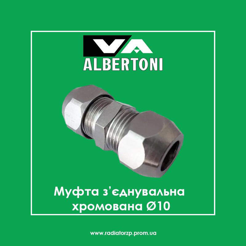 Муфта з’єднувальна Albertoni d10 мм Albertoni муфта хром Ø10 мм Хромовані фітинги, крани з латуні і хромовані мідні трубки. За допомогою цих перехідників і хромованою мідної трубки можна підключати прилади, виключивши використання гнучких шлангів, використання яких часто призводять до аварійних ситуацій. Підключення, в якому використовуються фітинги та хромовані мідні трубки — це висока надійність і прекрасний зовнішній вигляд. Купити муфту хромовану Ø10 мм Albertoni, Ви можете оформивши замовлення на нашому сайті radiatorzp.******* В наявності і під замовлення великий асортимент продукції для каналізації, опалення та водопостачання. Запрошуємо до співпраці торгуючі та монтажні організації. Замовляючі продукцію VA Albertoni в онлайн магазині radiatorzp.*******, Ви гарантовано купуєте продукт високої якості.
