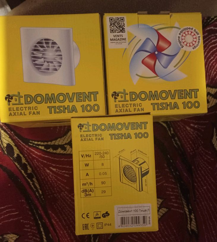Тип вентилятора: Витяжні Кілька примірників у наявності Вентилятор Домовент 100 Тиша Л. Новий. Тихий, рівень шуму 29дБ.. Двигун на кулько-підшипниках. Продуктивність 90м3/год. Є зворотній клапан. Енергозберігаючий. Самовивіз Київ Голосіївський район. Відправка НП, Укрпоштою, Міст експрес.