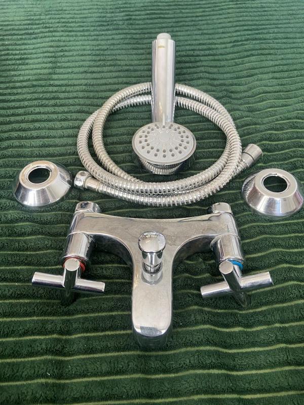 Змішувач у ванну Armatura б/в в робочому стані на поверхні є сліди від миючих засобів картриджі - керамічні, бажано замінити на нові (може котрийсь підкапувати) Комплект: змішувач на 2 вентилі, шланг, душова головка.