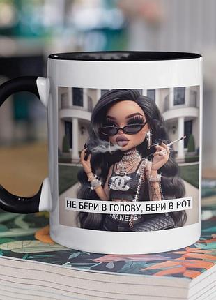 Чашка керамічна з принтом "не бери в голову" 330 мл, біла з рожевою ручкою