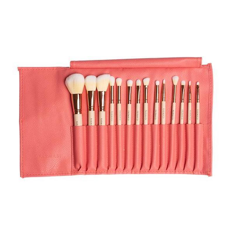 Ваша нова секретна зброя для створення ідеального макіяжу -шедевра. Повний набір пензлів. 14 різних пензлів, призначених для нанесення та розтушування макіяжу. Особливості набору пензликів для макіяжу в косметичці від Farmasi: - забезпечують ідеальне нанесення та розтушування; - підходять для чутливої ї шкіри; - кисті відрізняються зносостійкістю, легко очищаються; - не линяють та довго зберігають свої первісні якості; - можуть застосовуватись як для особистого, так і для професійного користування. Склад пензлів: 1.Круглий пензлик для пудри. 2.Пензлик для рум'ян. 3.Скошена пензлик для рум'ян. 4.Конусний пензлик для розтушовування тіней. 5.Пензлик для розтушовування тіней. 6.Плоский пензлик для тіней. 7.Пензель для консилера або коректора. 8.Скошена пензлик для тіней. 9.Круглий пензлик-бочонок для розтушовування тіней. 10.Кругла пензлик для губ. 11.Пензлик для розтушовки. 12.Пензель для кремових тіней. 13.Пензель для губ. 14.Скошена пензлик для брів / підводки