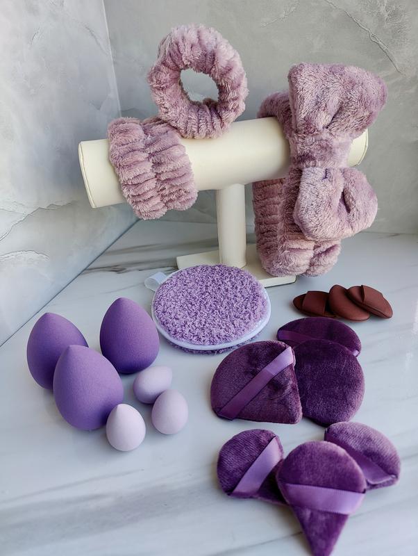 Набор косметических спонжей, бюти блендеров разных размеров и повязка на голову с напульсн...