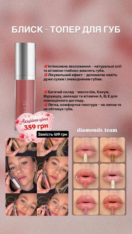 🌸 Весна уже близко... Час сяяти по-новому! Скоро солнце станет теплее, настроение — ярче, а образы — легче. И знаете что? Ваши губы тоже должны сиять! ✨ Именно поэтому я обожаю блески для губ от Farmasi - это не просто блеск, это настроение, уверенность и женственность в одном тюбике 💕 💎 Топпер – для эффекта «вау» Идеальный вариант, если хотите добавить сияние поверх любимой помады или карандаша. ✔ красиво переливается ✔ визуально делает губы более объемными ✔ не липкий ✔ добавляет праздничного блеска даже дневному образу Нанесли — и образ сразу дороже 😍 💋 Цена свирепая 359 грн♥️вместо 419.