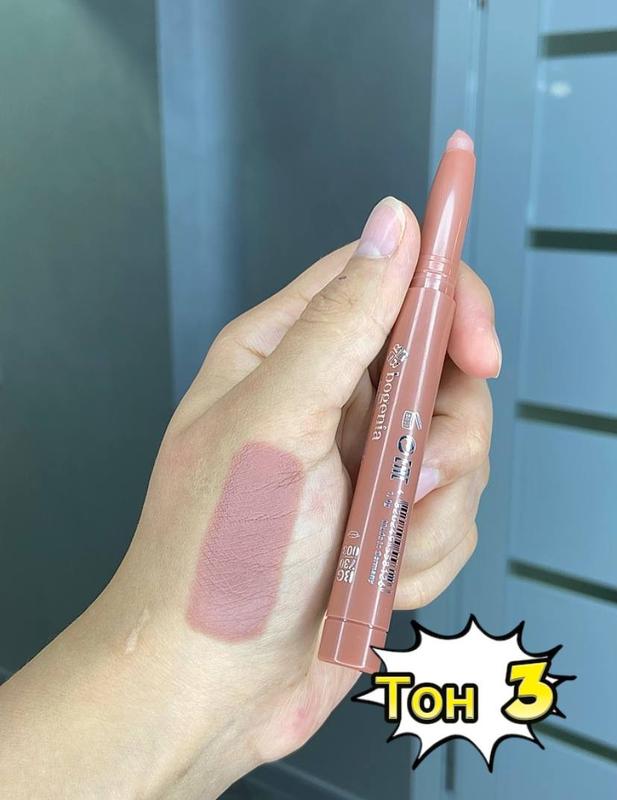 Помада-олівець для губ Bogenia має ряд безперечних переваг. Вона дозволяє підкоригувати форму губ, зробивши їх пишнішими та об'ємними. Вона виглядає доречно і ефектно не лише в повсякденних, а й вечірніх макіяжах. Та і врешті- решт, вона фантастично красива. Переваги: - продукт 2 в 1 - олівець і помада в одному стіку; - матовий фініш і насичений пігмент вже після одного шару; - грифель скошеної форми - для максимально чіткого контуру; - не потребує заточування; - чудова стійкість - не розтікається і не боїться вологи; - склад збагачений оліям жожоба і вітаміном Е; - не стягує шкіру і забезпечує комфорт.