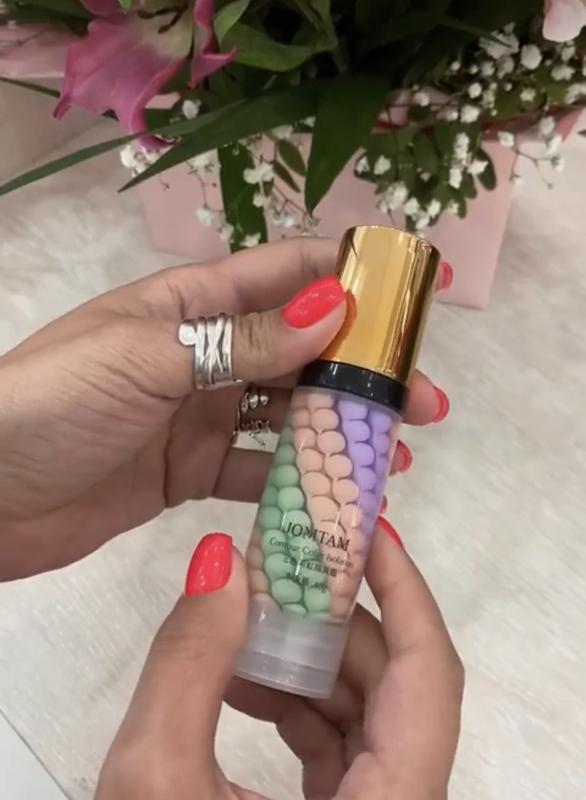 Восстанавливающая база под макияж 3в1. * Три тонирующих цвета, которые в виде капель крема разных оттенков погружены в легкий гель. • Она идеально скрывает все недостатки текстуры кожи, и совершенствует оттенок. Отличный продукт для идеального макияжа! . Основная функция базы - это увлажнение кожи, разглаживание мелких линий и морщин, выравнивание рельефа. ! Она скрывает поры, делает нанесение тональных средств проще и экономичнее. ! Нормализует работу сальных желез и фиксирует макияж. ! Важно! База не является тональным кремом, она наносится для усовершенствования рельефа кожи под тональный крем. Корректор состоит из трех цветов, которые при нанесении смешиваются ® [?]Розовый корректор - придает лицу здоровый тон, маскирует синяки и пигментные пятна. • Фиолетовый корректор - убирает желтизну лица. Нейтрализует тусклый цвет лица и дарит сияние коже. О Зеленый корректор - нейтрализует покраснения, воспаления и раздражения. !! Ефект 3в1:!! ~ Выравнивает тон кожи, скрывает недостатки Скрывает покраснения, высыпания и поры на коже лица. ~ Осветляет кожу лица