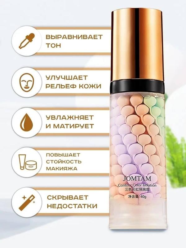 Вирівнююча база під макіяж від Jomtam Isolation має три тонуючі кольори, які у вигляді крапель крему різних відтінків занурені у легкий гель. Вона ідеально приховує всі недоліки текстури шкіри, і вдосконалює відтінок. Чудовий продукт для ідеального макіяжу! Основна функція бази - це зволоження шкіри, розгладжування дрібних ліній і зморшок, вирівнювання рельєфу. Вона приховує пори, робить нанесення тональних засобів простіше та економніше. Нормалізує роботу сальних залоз та фіксує макіяж.