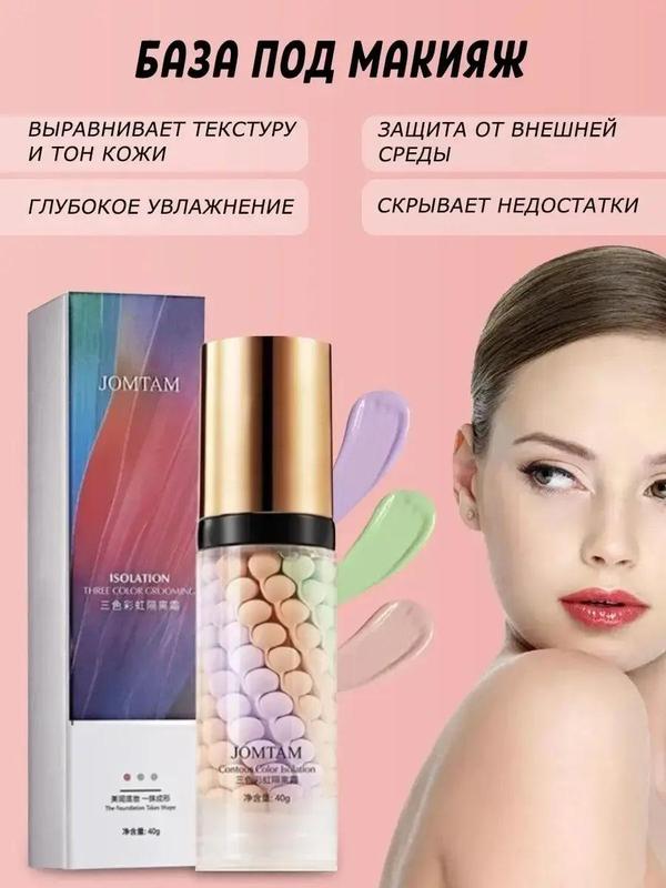 Триколірна база під макіяж Jomtam 40мол. Інноваційна, багатофункціональна та розумна основа під макіяж JOMTAM забезпечує потрійну дію: ефективно вирівнює текстуру шкіри, ідеально приховує всі недоліки та фіксує макіяж.
