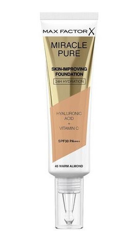 Тональна основа для лица Max Factor Miracle Pure Skin-Improving Foundation SPF 30 PA+++ 45 Warm Almond, 30 мл Безупречно гладкая, сияющая кожа -- благодаря Miracle Pure Skin-Improving Foundation SPF 30 PA+++. Основа улучшает не только вид, но и состояние кожи! Преимущества продукта - Неплотная кремовая консистенция -- средство удобно наносить и распределять, оно создает равномерное тонкое покрытие. - Натуральный оттенок -- макияж выглядит максимально естественно. - Маскирующие свойства -- основа скрывает несовершенства, выравнивает цвет лица, придает сияние. - Ухаживающий эффект -- усовершенствованный продукт обеспечивает увлажнение в течение 24 часов. - Защита от солнца -- основа снижает негативное влияние УФ-излучения благодаря SPF 30. Тюбик оснащен удобным зауженным аппликатором, который обеспечивает высокий комфорт использования кремового средства, смешивает ухаживающую составляющую и тональную базу перед нанесением. Уникальный продукт на 91 % состоит из ценных ухаживающих компонентов. Благодаря свойствам масла кокоса, экстрактов люцерны и гороха, гиалуроновой кислоты, витамина С, сквалена и аллантоина основа мгновенно увлажняет кожу, разглаживает ее микрорельеф, улучшает цвет, повышает эластичность, дарит сияние и шелковистость.