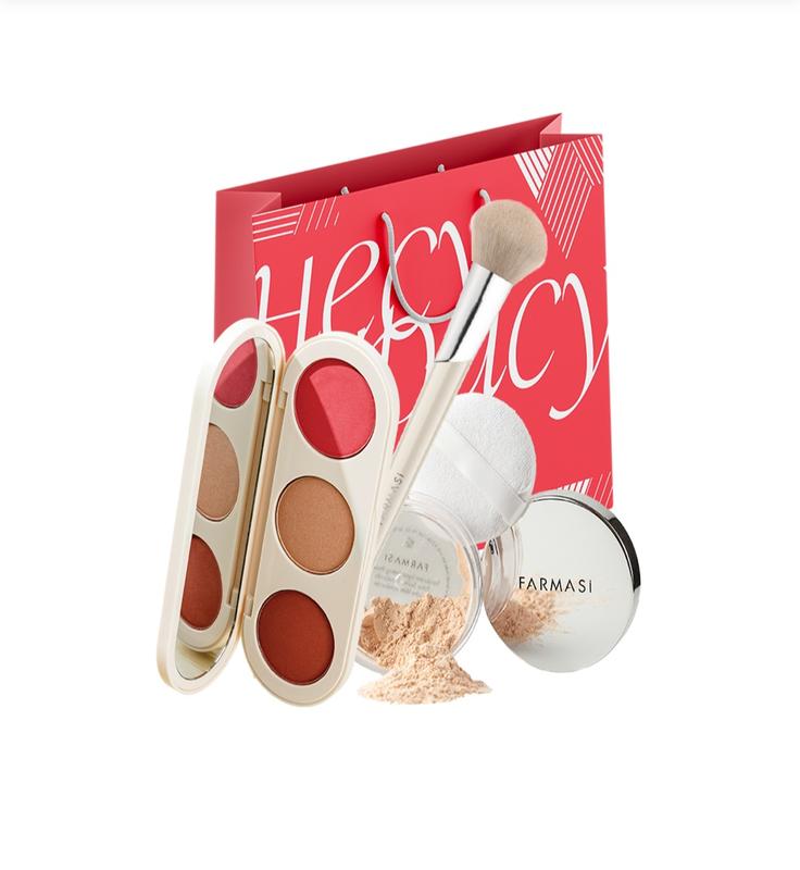 В набор входят: 1001544 Розсипчаста пудра, 4,8 г 1001439 Палетка для обличчя 3in1, 13 г 900935 Кисточка для румян и пудры Пакет