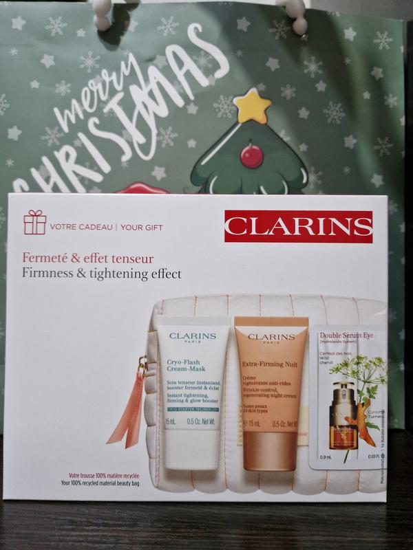 Новый, оригинал! Набор ухода за лицом Clarins. Replenishing radiance, в который входят: Extra-Firming Energy, крем для лица, для всех типов кожи 15ml Extra-Firming Nuit восстанавливающий ночной крем для всех типов кожи, 15ml Double Serum Eye, подвійна сироватка для контуру очей, 0,9ml Косметичка