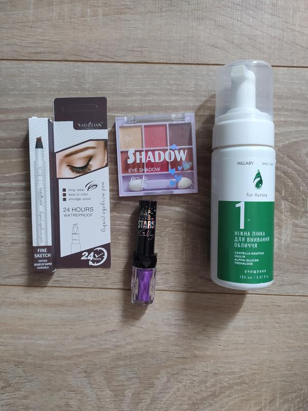 Косметика которой не пользуюсь. Все новое кроме пенки для умывания, ее несколько раз тестировала. В наборе тени, тени для подводки сиреневые, рассыпчатые, маркер для бровей, пенка для умывания.
