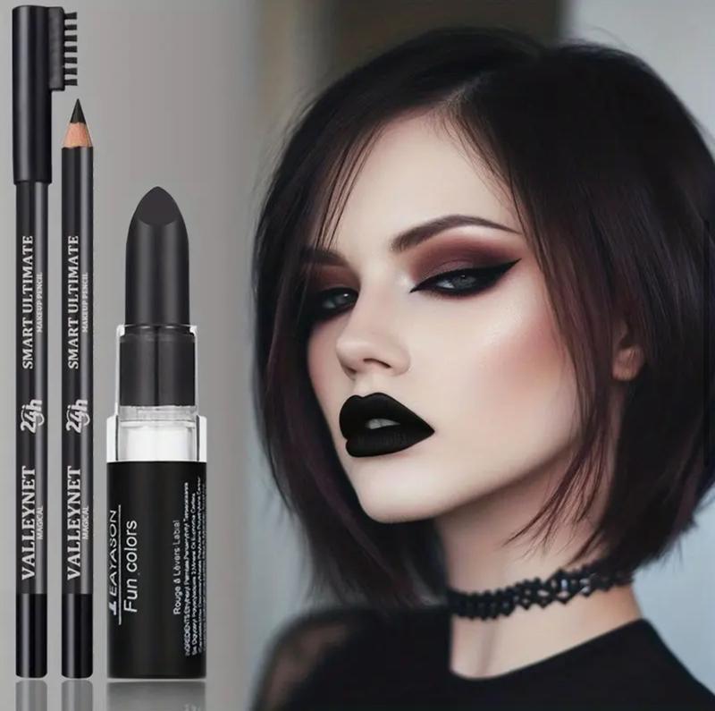 Набор темного макияжа 2 шт. - Матовая черная помада и карандаш для губ, панк-визаж, стойкий матовый финиш, для Хэллоуина, на каждый день и для особых событий, для всех типов светло-бежевого (включая чувствительную кожу), для макияжа на Хэллоуин, макияж для событий, эдги макияж