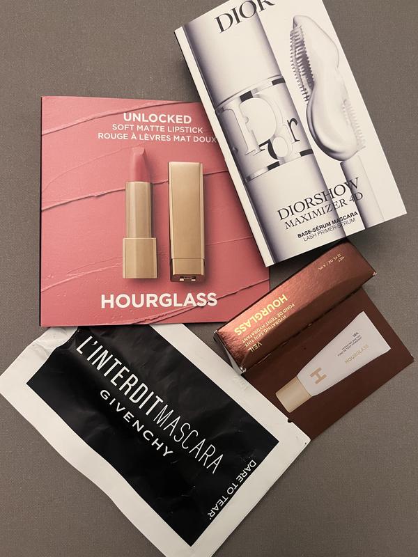 Набір містить пробники: Diorshow Maximizer 4D Праймер-сироватка для вій з 4 діями: об'єм, довжина, завиток і чіткість 1 мл Туш для вій GIVENCHY L'Interdit 1,8 гр чорна Матова помада для губ Hourglass Unlocked Soft Matte Lipstick відтінки red 0, tulip 344, peony 348, foxglove 356 Зволожуюча тональна основа-тінт Hourglass Veil Hydrating Skin Tint колір 3 Fair Neutral 4 ml