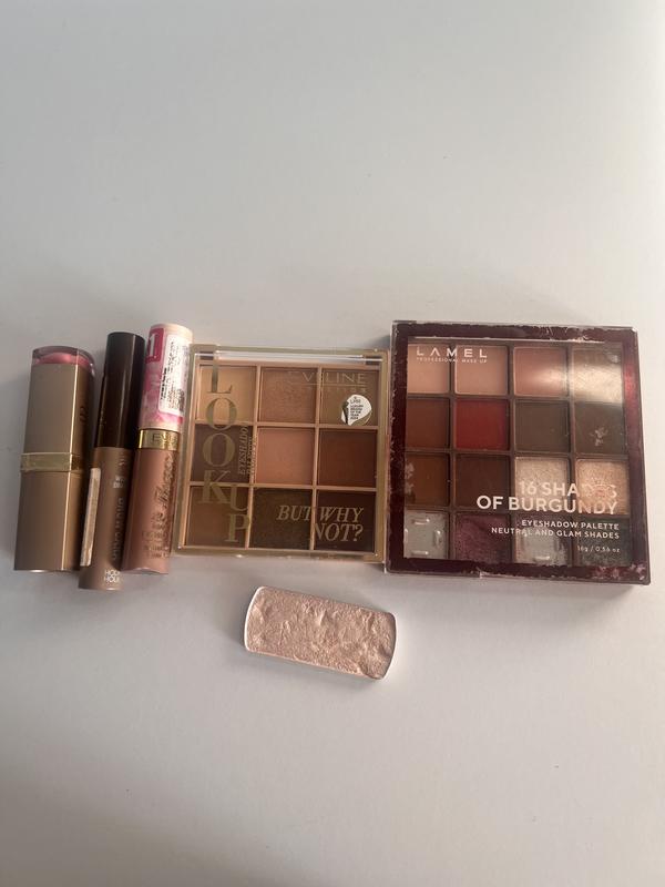 Ціна за все. Палетка Eveline зробила два макіяжі, термін до 2028 р Палетка Lamel, стан на фото, термін до 06.2027 Рідкі тіні Eveline у відтінку 03, практично повна банка Помадка для брів Holika holika у 01 відтінку, для світлих дівчат. Хайлайтер тестер у холодному 01 відтінків. Помада Malva у 26 відтінку